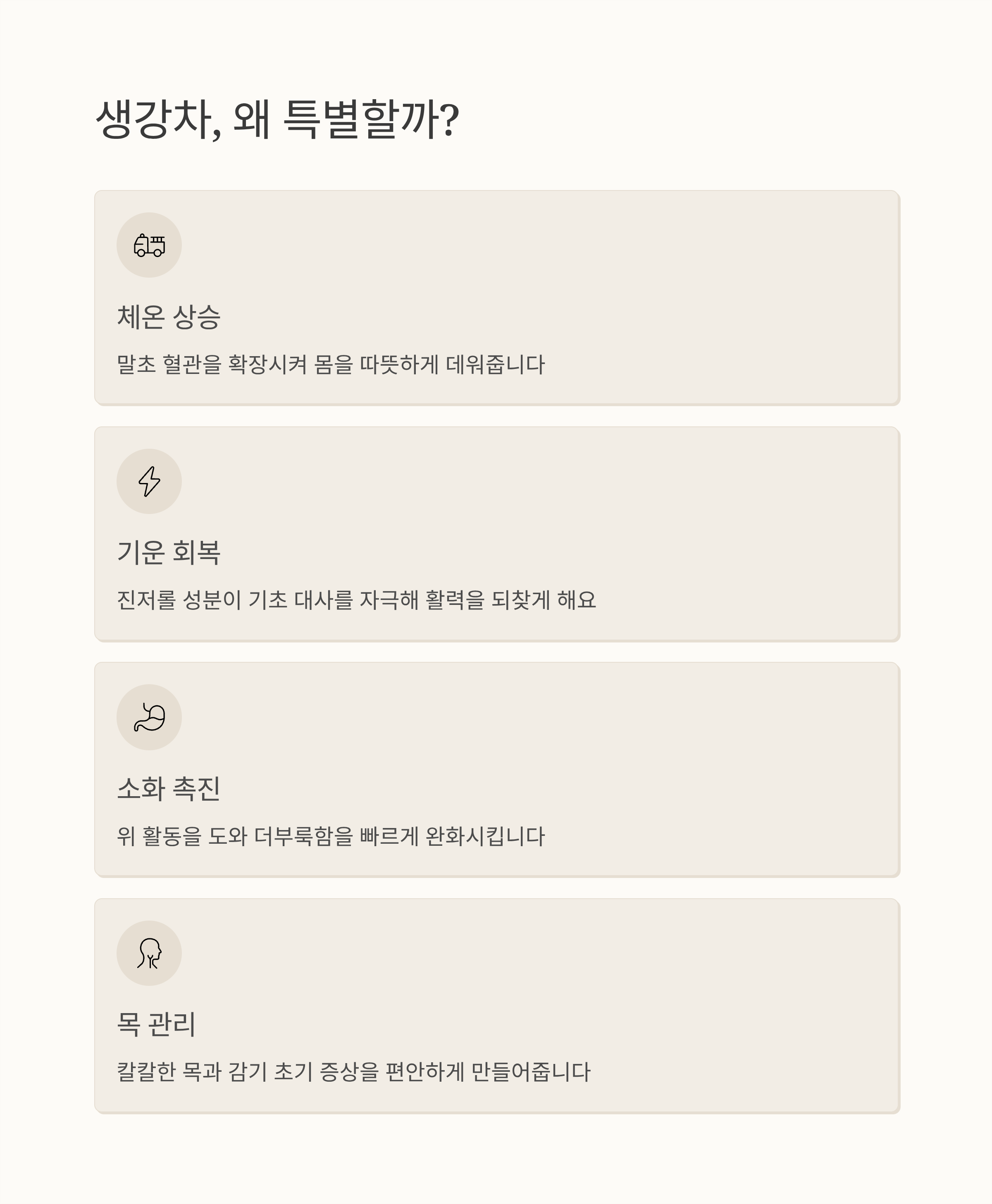 피로할 때 생강차가 ‘기적의 한 잔’처럼 느껴지는 것입니다.