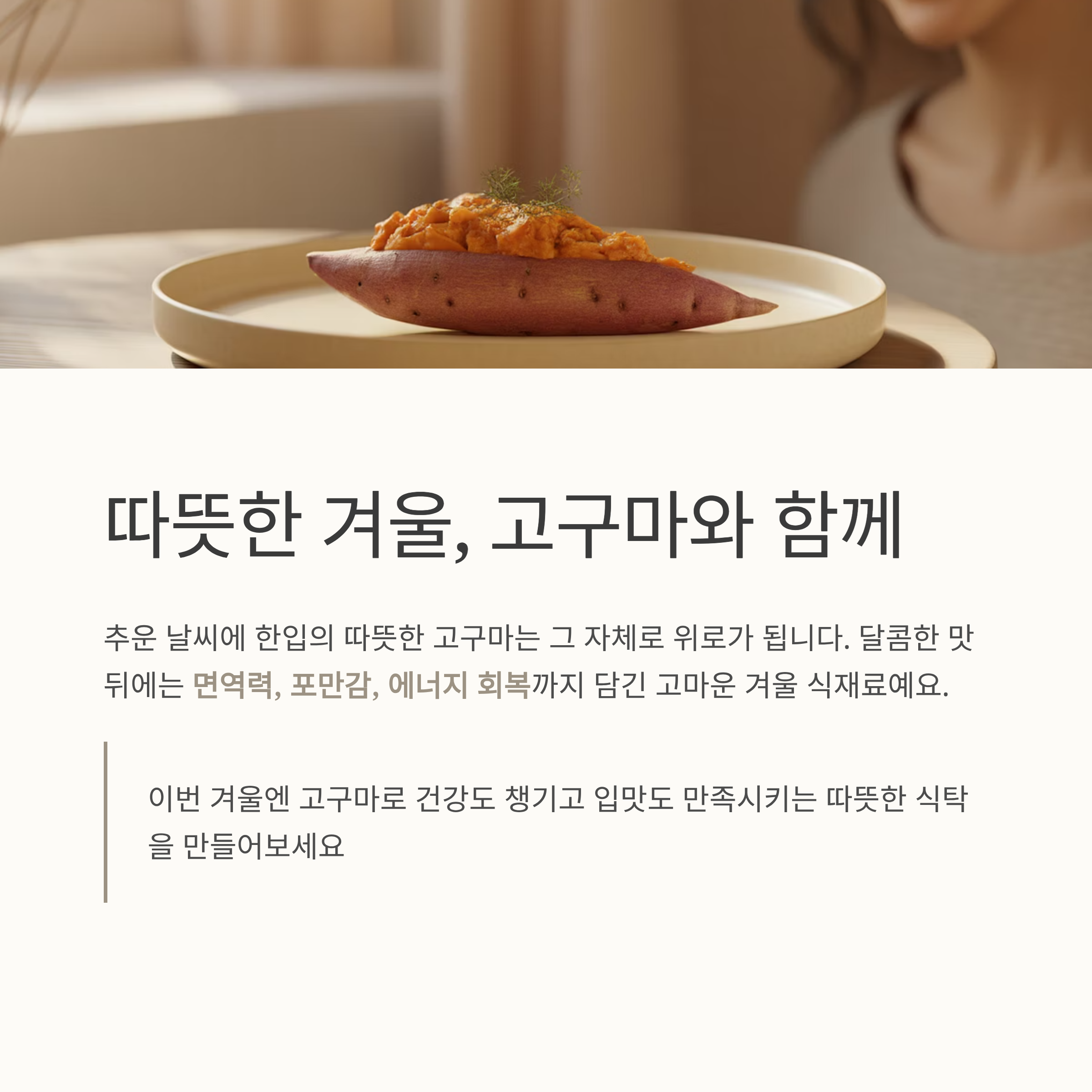 한입의 따뜻한 고구마는 그 자체로 위로가 됩니다.