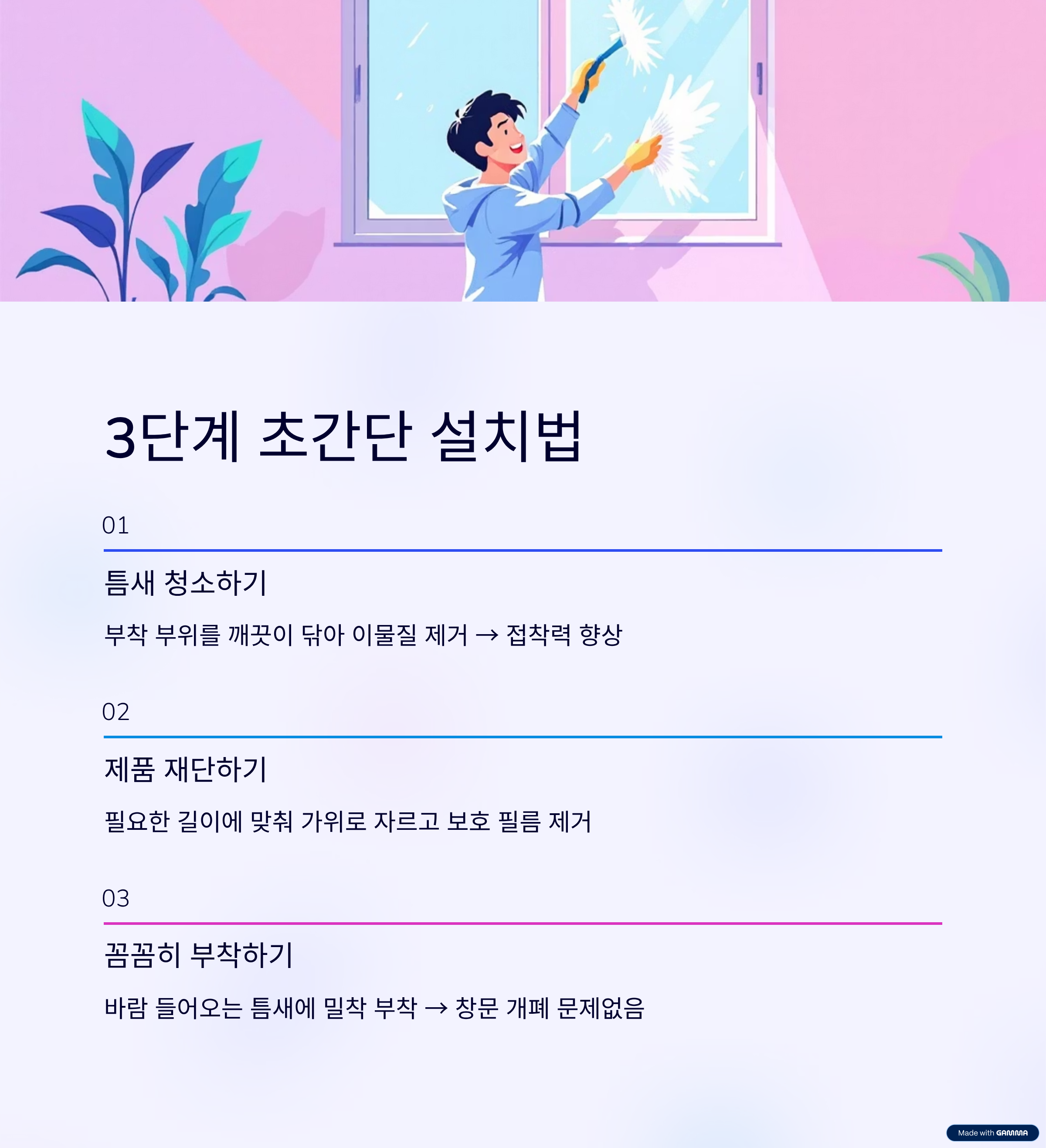 또한, 틈새를 막아주면서 외부의 소음 차단에도 효과적이며, 미세먼지 유입까지 줄여주는 부수적인 효과를 기대할 수 있습니다.