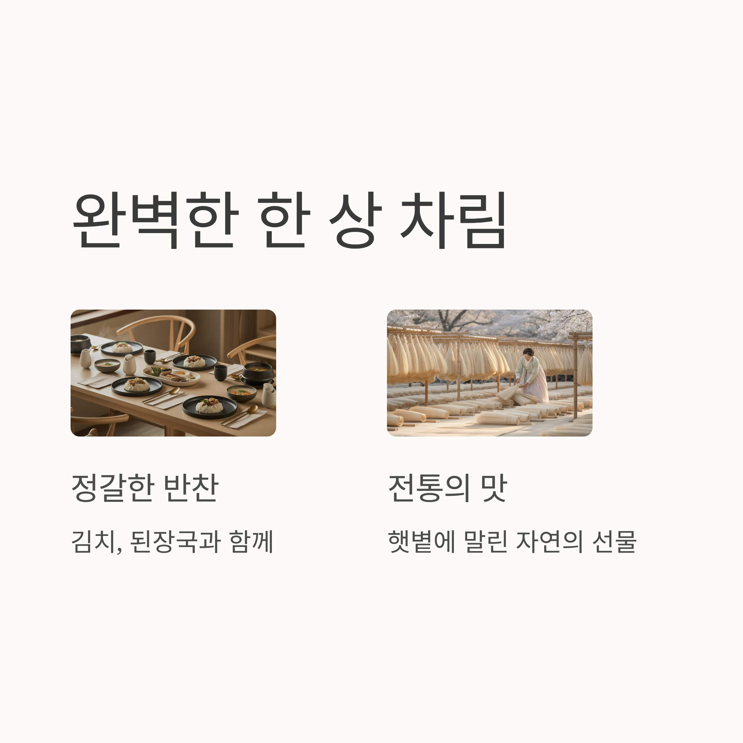 | 국 | 된장국, 미역국 | 밥의 구수함을 살려주는 조합 |
