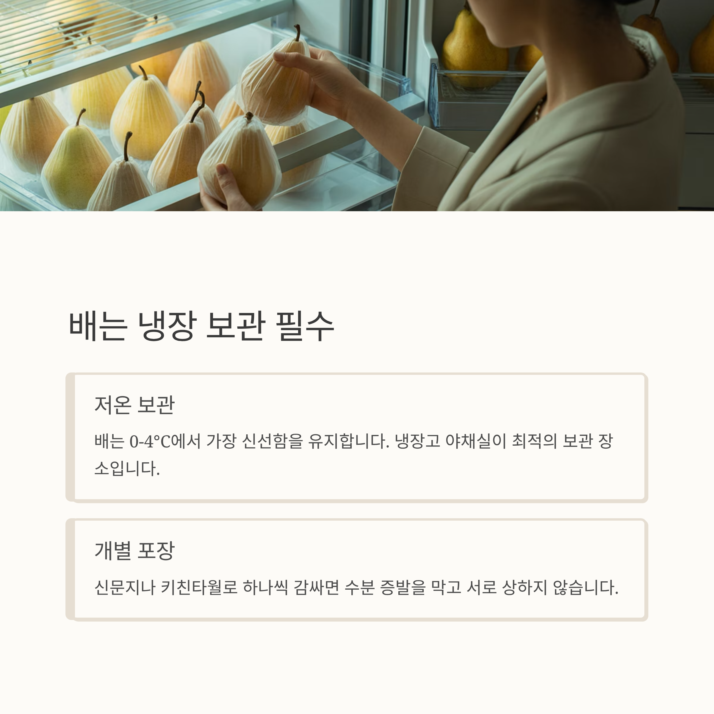 배는 껍질이 두꺼운 편이지만 수분이 많아 쉽게 물러질 수 있습니다. 특히 찬 기운에 강하므로 냉장 보관이 적합해요. 신문지로 하나씩 감싼 뒤 냉장고에 보관하면 아삭한 식감을 오래 유지할 수 있습니다.