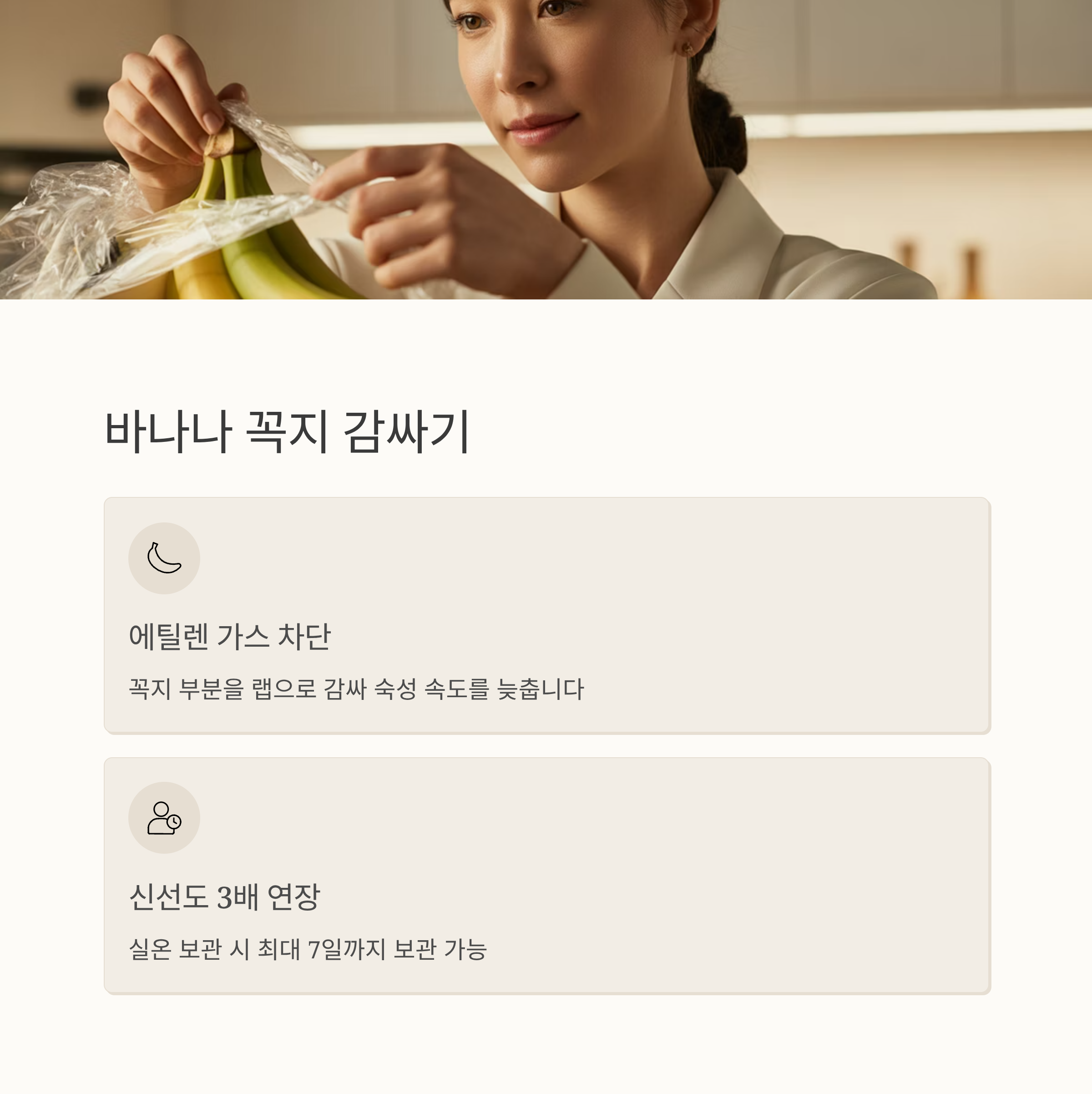 바나나는 열대과일이라 냉장고에 넣으면 껍질이 빠르게 검게 변해버립니다. 실온에서도 숙성이 빠르기 때문에 조금만 방심해도 금방 무르게 되죠. 그래서 바나나를 오래 두고 먹고 싶다면 꼭지를 랩이나 호일로 감싸는 것이 매우 중요합니다. 바나나는 에틸렌 가스를 분비해 스스로를 빠르게 숙성시키는데, 이 가스는 꼭지를 통해 가장 많이 나와요. 꼭지를 감싸면 가스의 확산이 느려지고, 숙성도 천천히 진행돼 2~3일은 더 신선하게 유지됩니다.