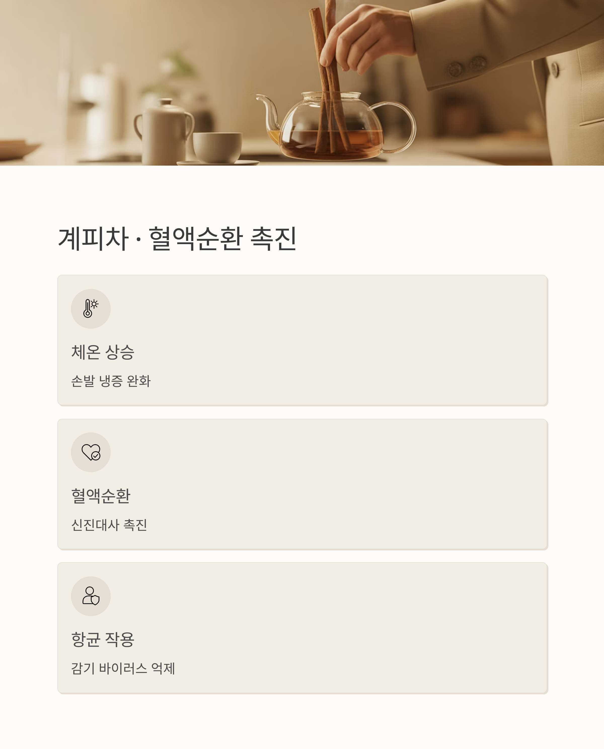 - 이유: 계피는 따뜻한 성질을 가지고 있으며, 생강과 함께 섭취할 경우 체온 상승 효과가 커서 감기 예방에 탁월합니다. 특히 몸이 찬 편인 분들께 추천합니다.