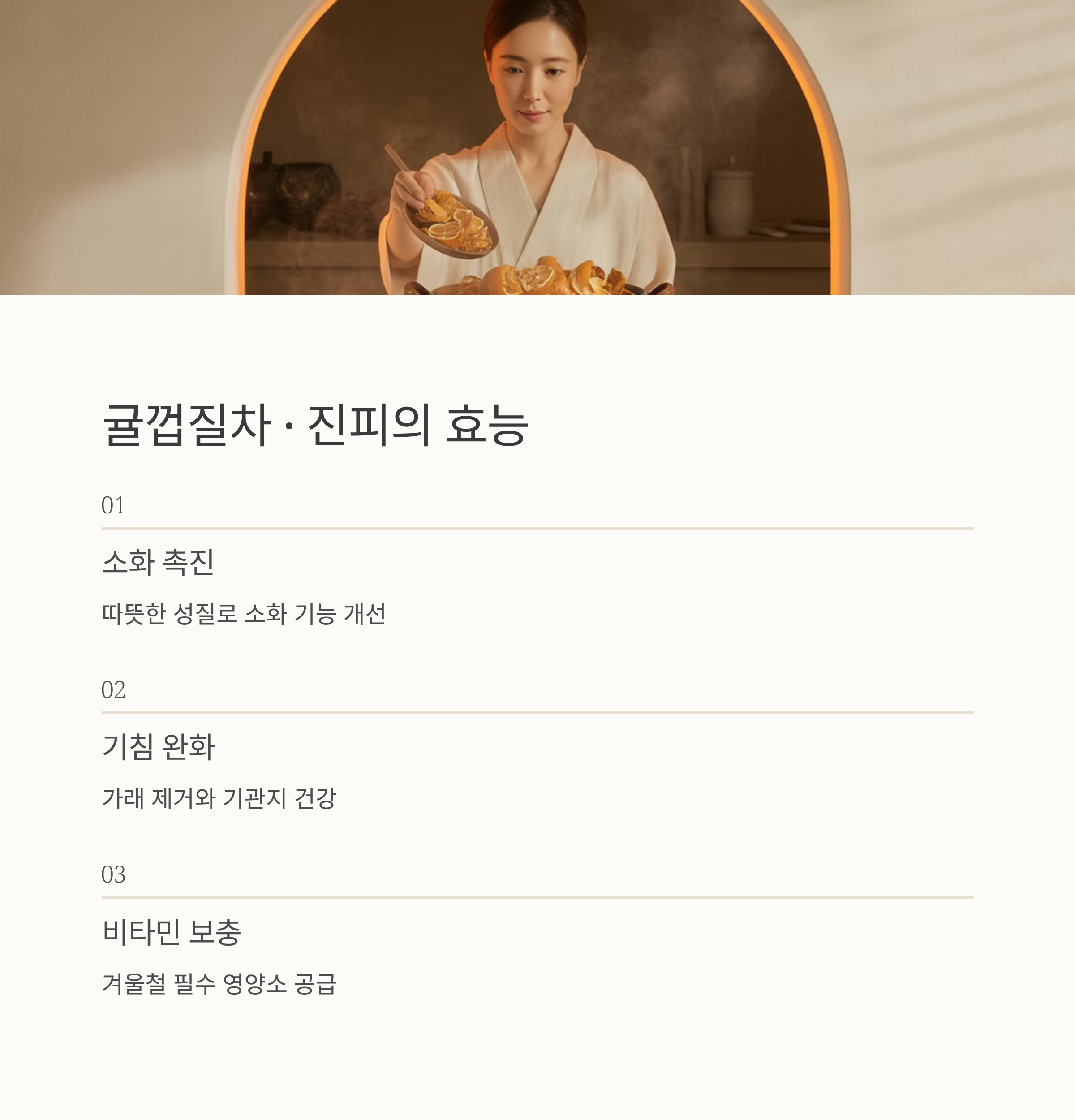 - 섭취법: 잘 말린 귤껍질을 물에 넣고 은은하게 끓인 후 꿀을 타 마십니다. 향긋하면서도 쌉쌀한 풍미가 매력적입니다.