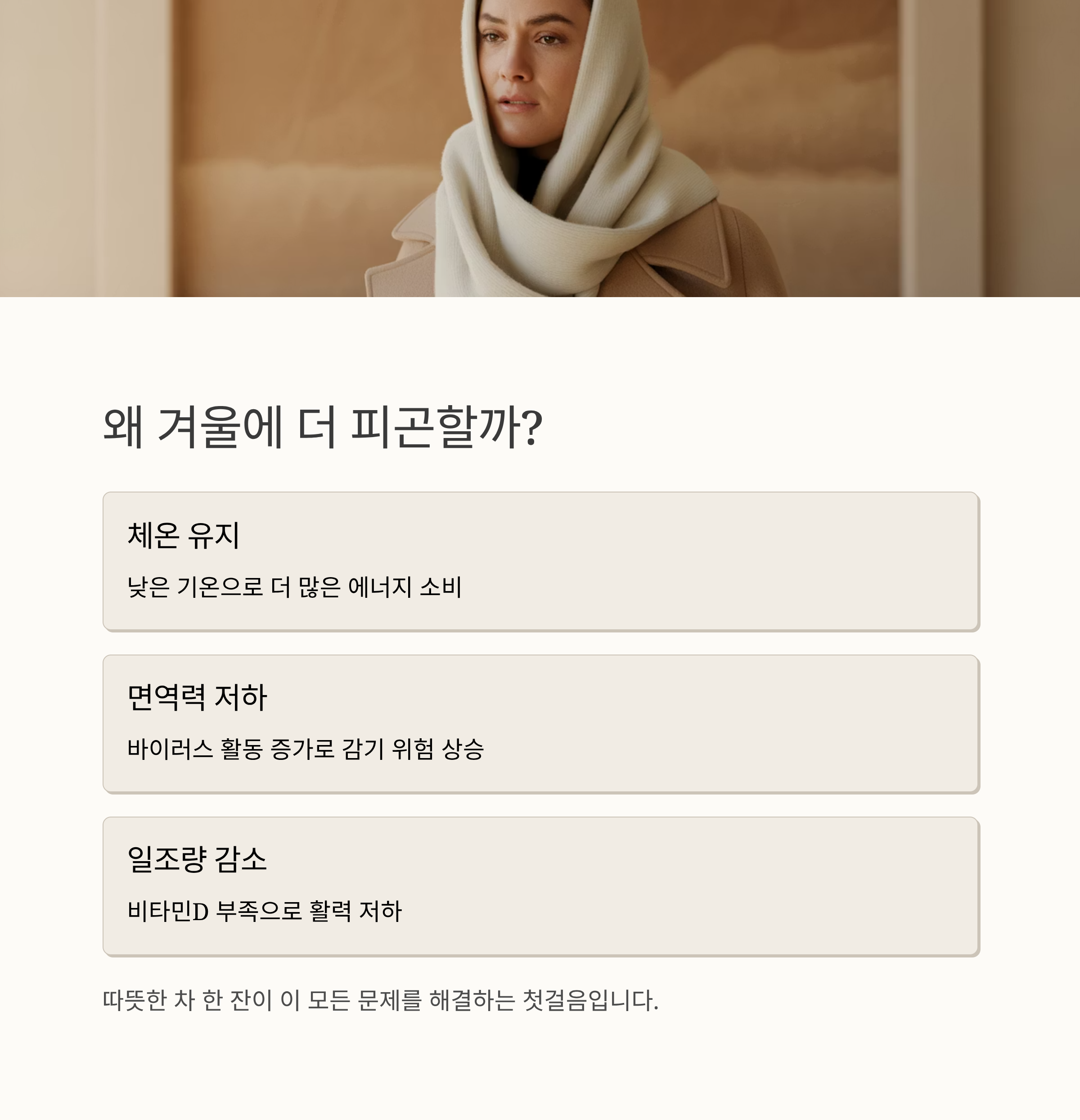 추운 겨울이 찾아오면 몸은 자연스레 웅크려지고, 에너지가 쉽게 소진되는 느낌을 받기 쉬운데요. 기온이 낮아지면 우리 몸은 체온을 유지하기 위해 더 많은 에너지를 사용하게 되고, 동시에 피로감도 쉽게 느끼게 됩니다. 이런 시기일수록 면역력을 높이고 기력을 회복할 수 있는 따뜻한 한 잔의 차가 큰 도움이 되죠.