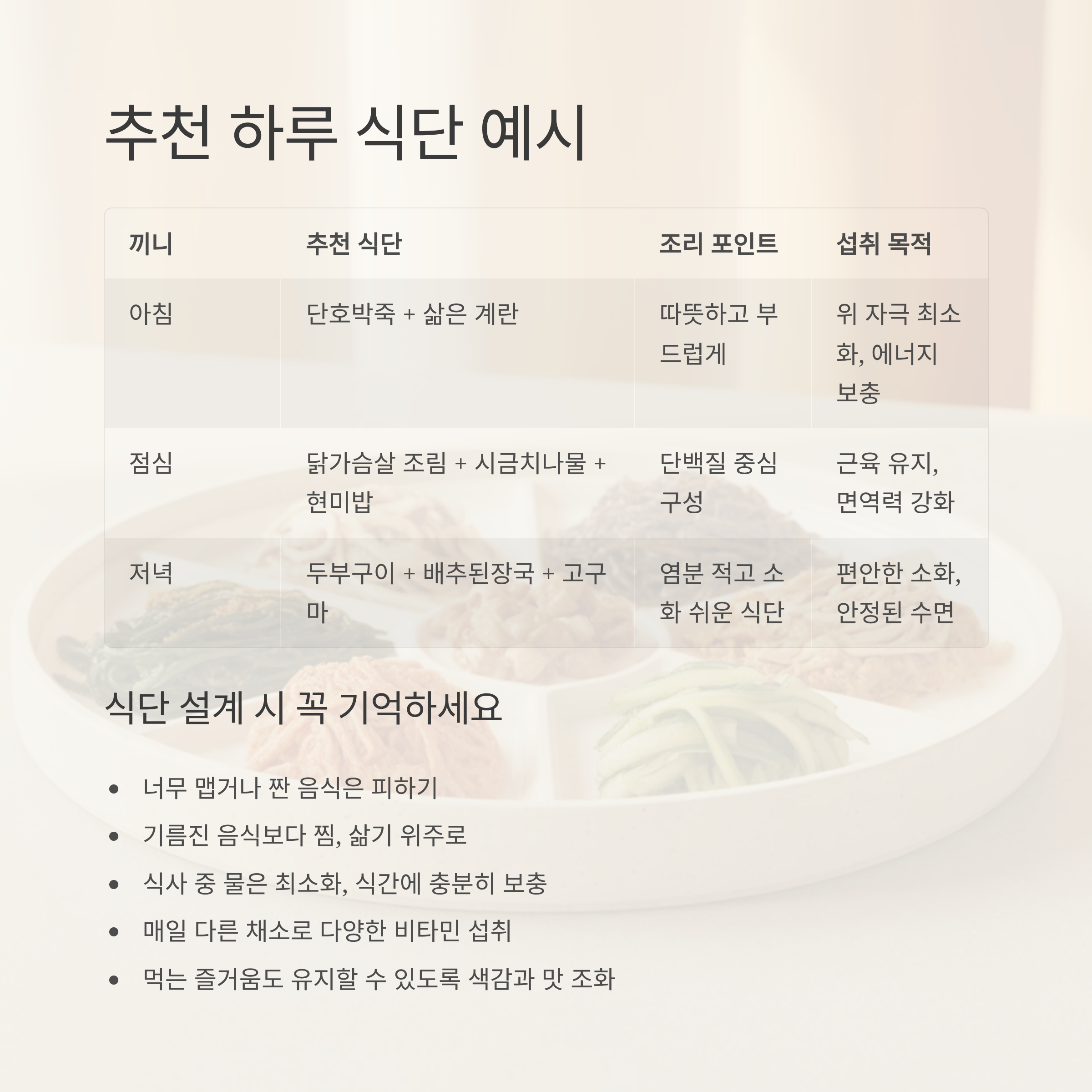 근육량 유지와 면역 기능을 위해 단백질 섭취는 필수예요. 특히 닭가슴살, 두부, 계란찜, 흰살생선 같은 소화에 부담 없는 단백질 식품을 점심에 중심으로 구성하면 좋아요.