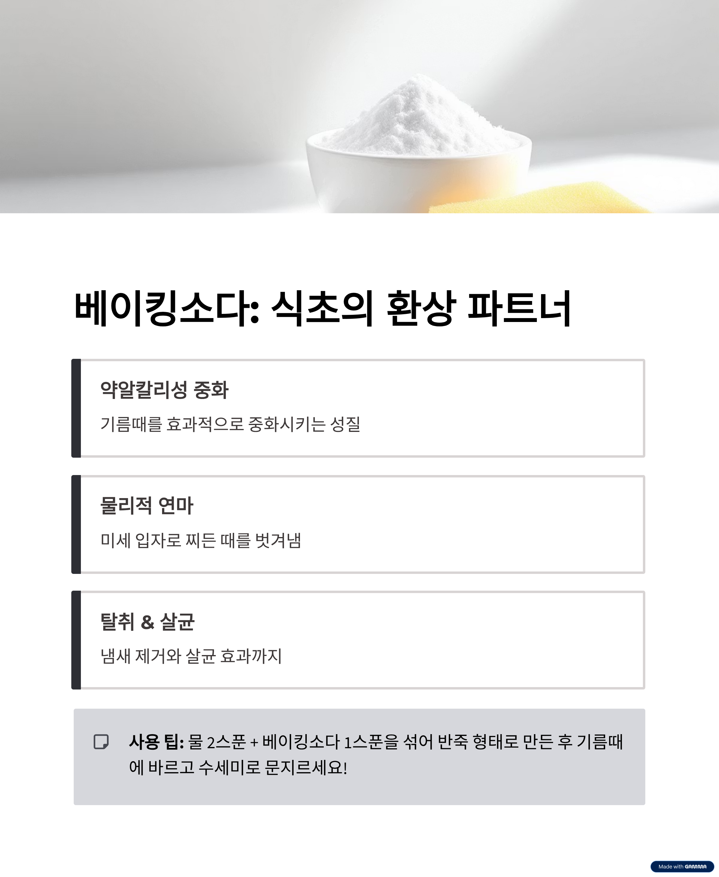 베이킹소다는 약알칼리성으로 기름때를 중화시키고, 미세한 입자의 연마 효과로 찌든 때를 물리적으로 제거하는 데 도움을 줍니다.