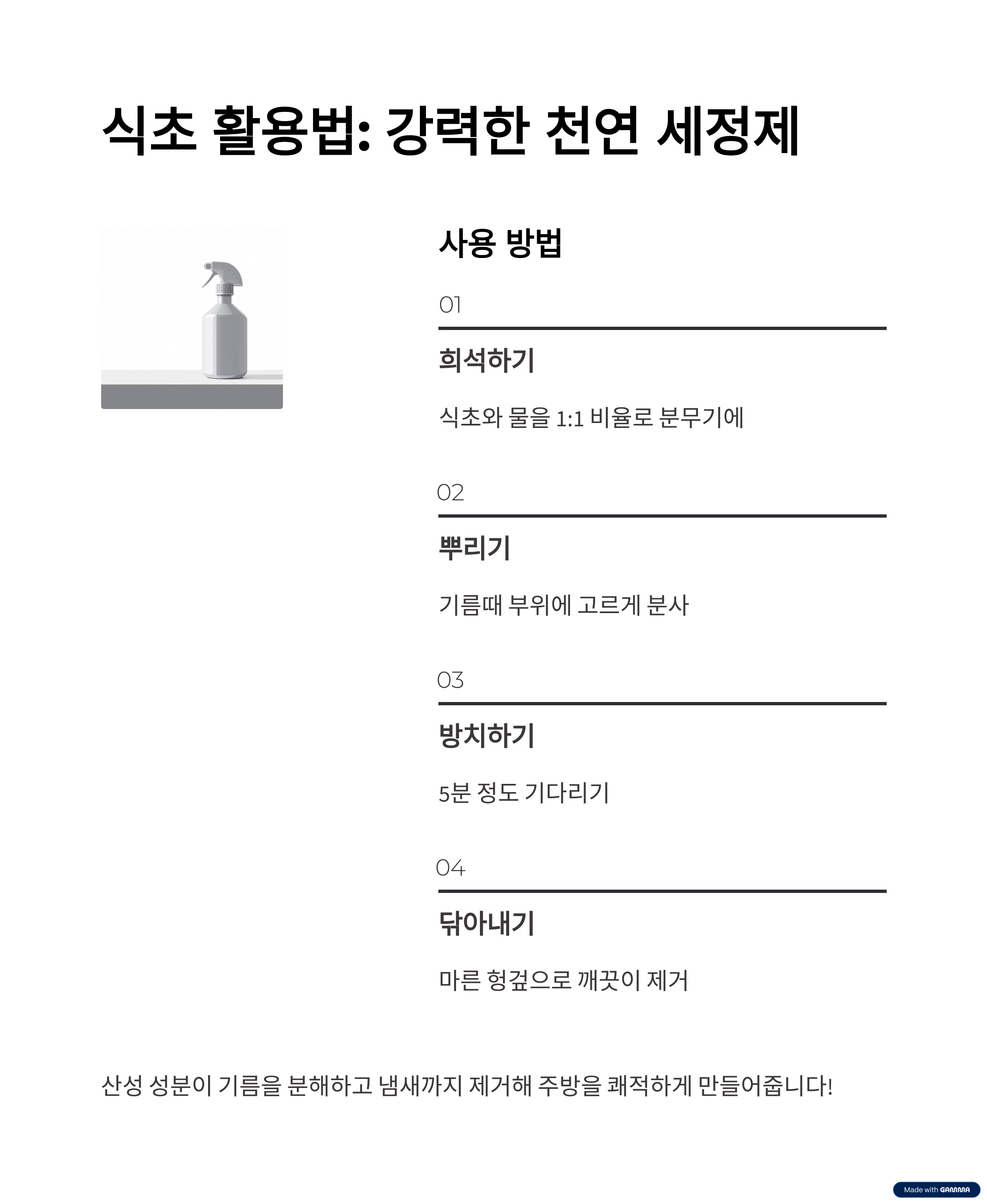 또한, 식초는 기름때 제거뿐만 아니라 냄새 제거 효과까지 덤으로 얻을 수 있어 주방을 더욱 쾌적하게 만들어줍니다.