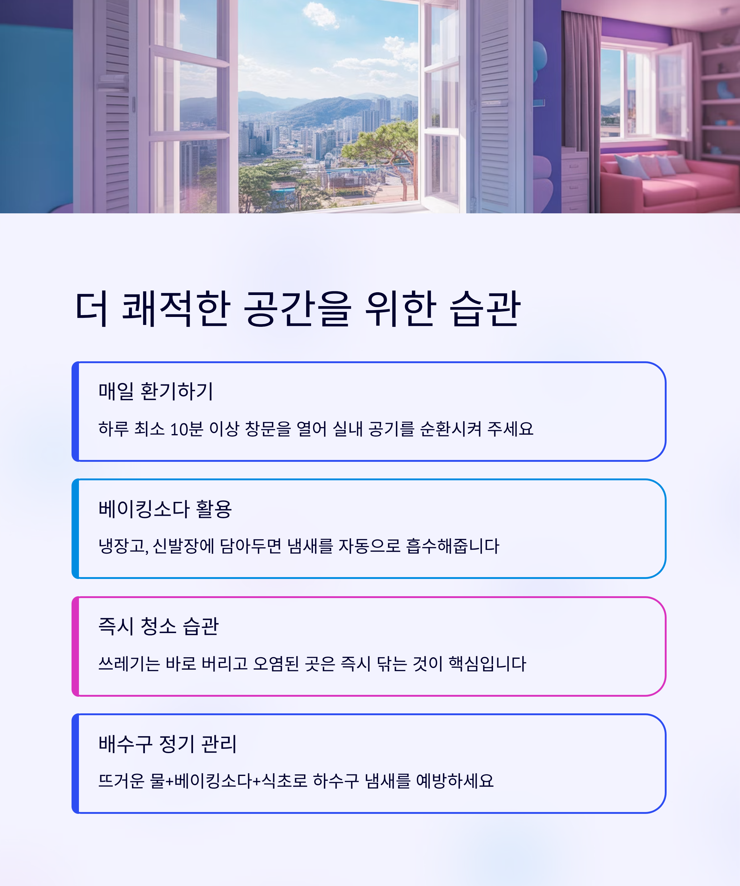 특히 요리 후나 습기가 많은 날에는 필수입니다.- 베이킹소다: 작은 그릇에 베이킹소다를 담아 냉장고, 신발장, 옷장 등에 두면 냄새를 흡수하는 효과가 탁월합니다.- 청결 유지: 악취의 근본적인 원인은 오염된 환경입니다.