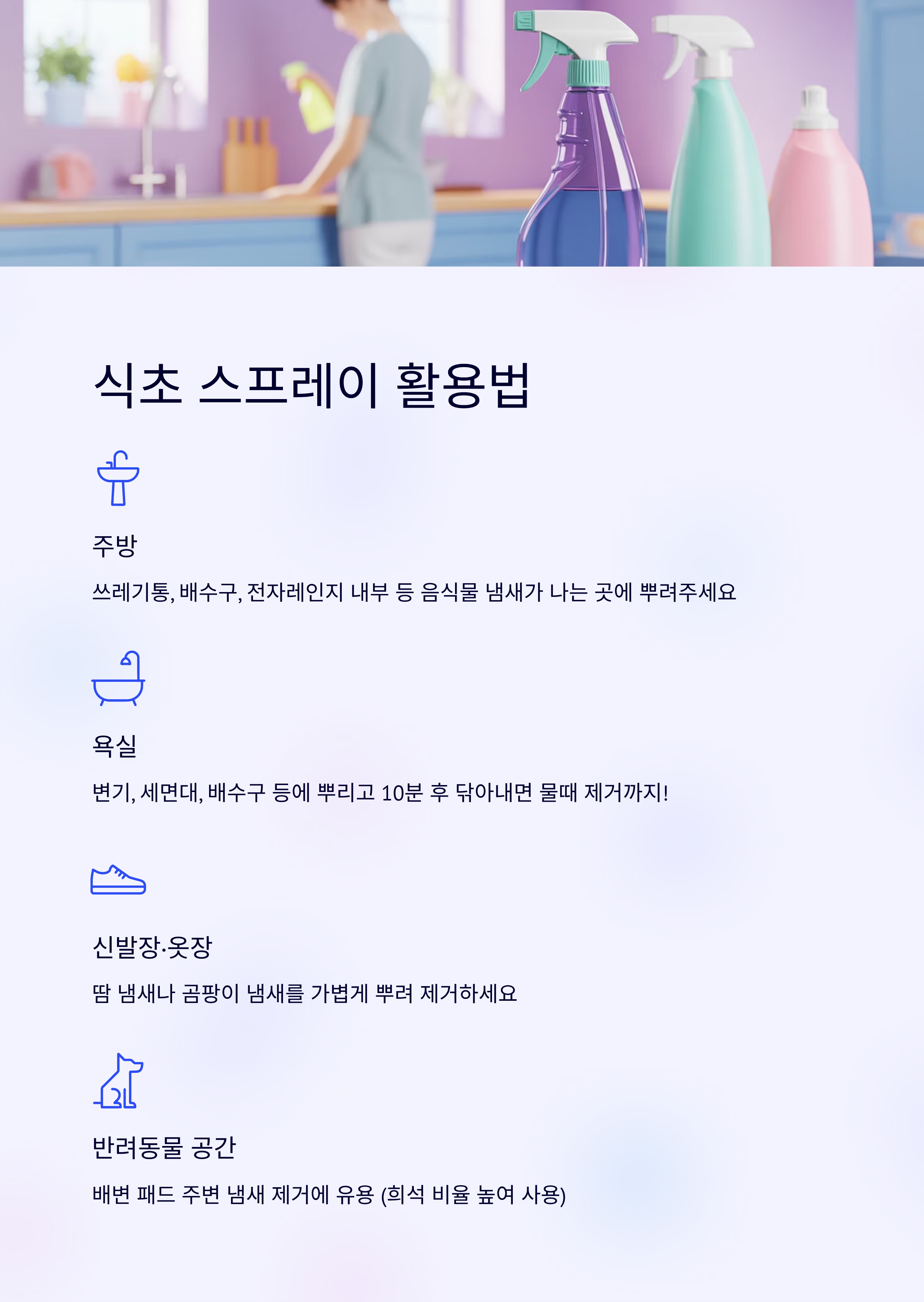 (색이 바랠 수 있는 섬유에는 주의)- 반려동물 공간: 반려동물 용품이나 배변 패드 주변의 냄새 제거에도 유용하지만, 반려동물이 직접 닿는 곳은 식초 희석 비율을 더 높여 약하게 사용하거나 사용 후 충분히 환기시켜야 합니다.