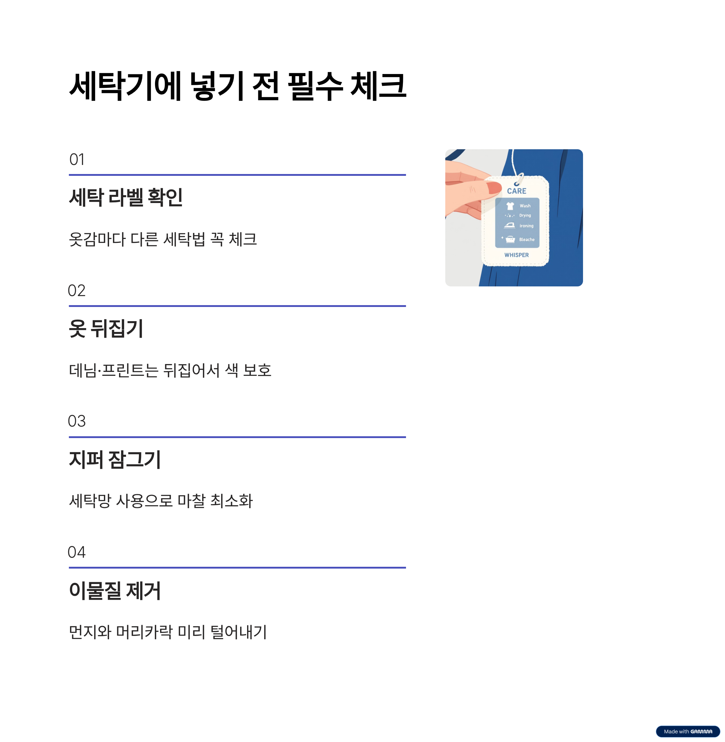 데님이나 프린트가 있는 옷은 뒤집어서 세탁해야 마찰로 인한 색 바램이나 프린트 손상을 막을 수 있습니다.