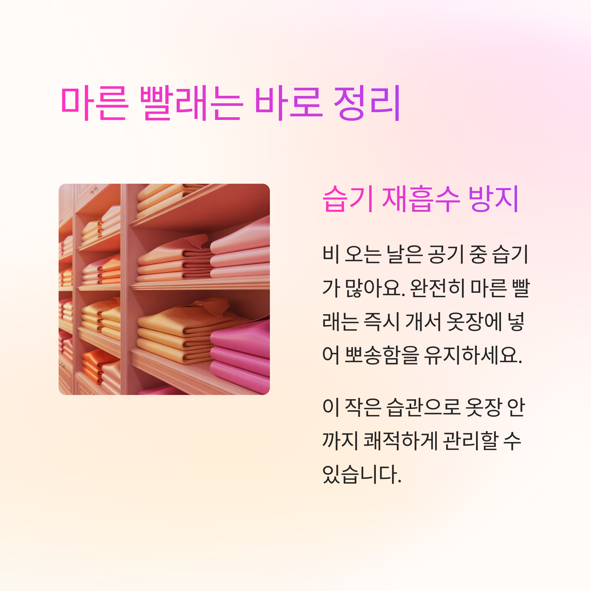 빠른 건조, 적절한 습도 조절, 올바른 세탁 방법, 그리고 즉각적인 정리 이 네 가지 핵심만 기억한다면, 비가 아무리 쏟아져도 우리 집 안은 언제나 쾌적한 햇살 가득한 공간이 될 거예요.