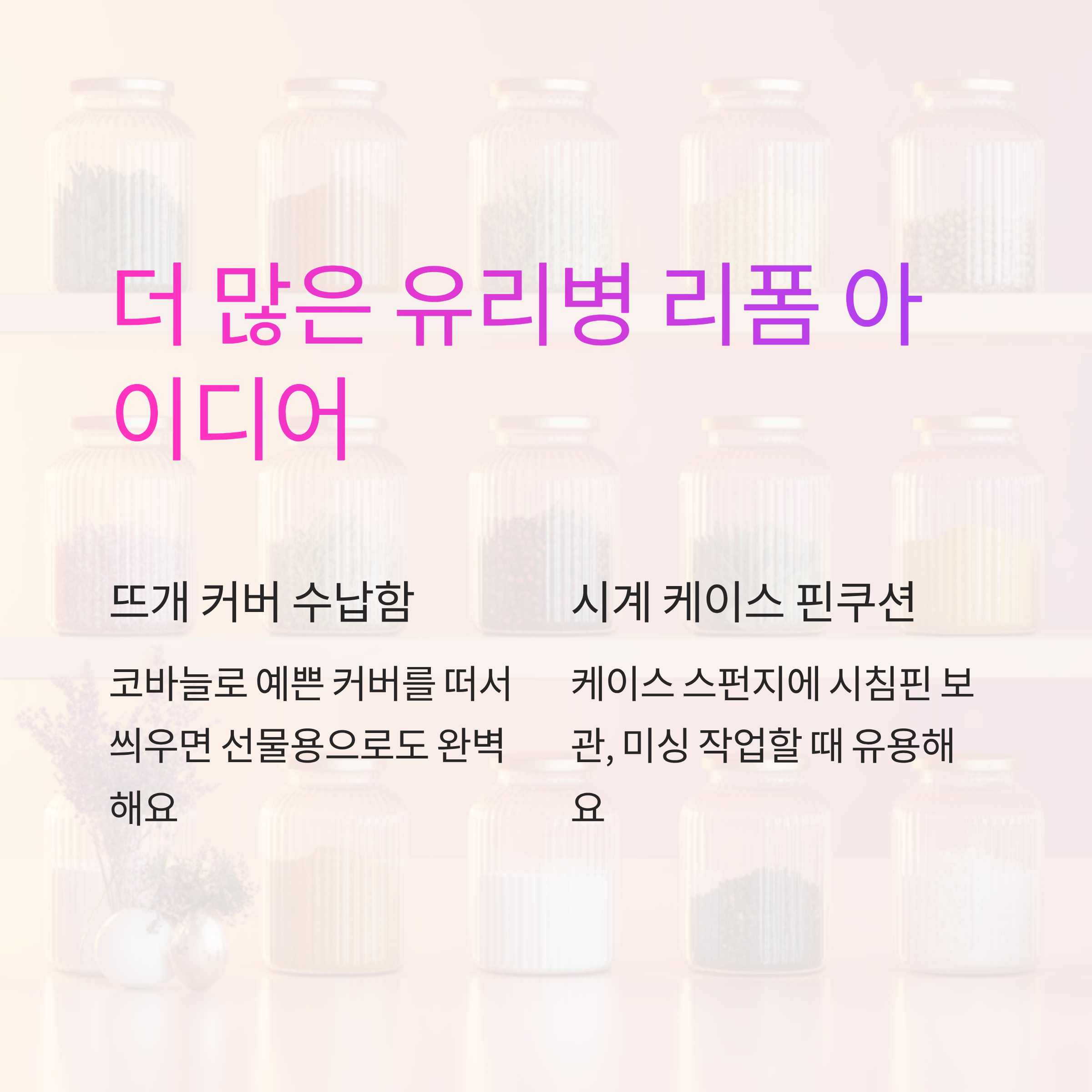 특히 얕고 통통한 유리병이 작업하기 편리하며, 버려질뻔한 재료들로 친환경적인 아이템을 만들 수 있어요.