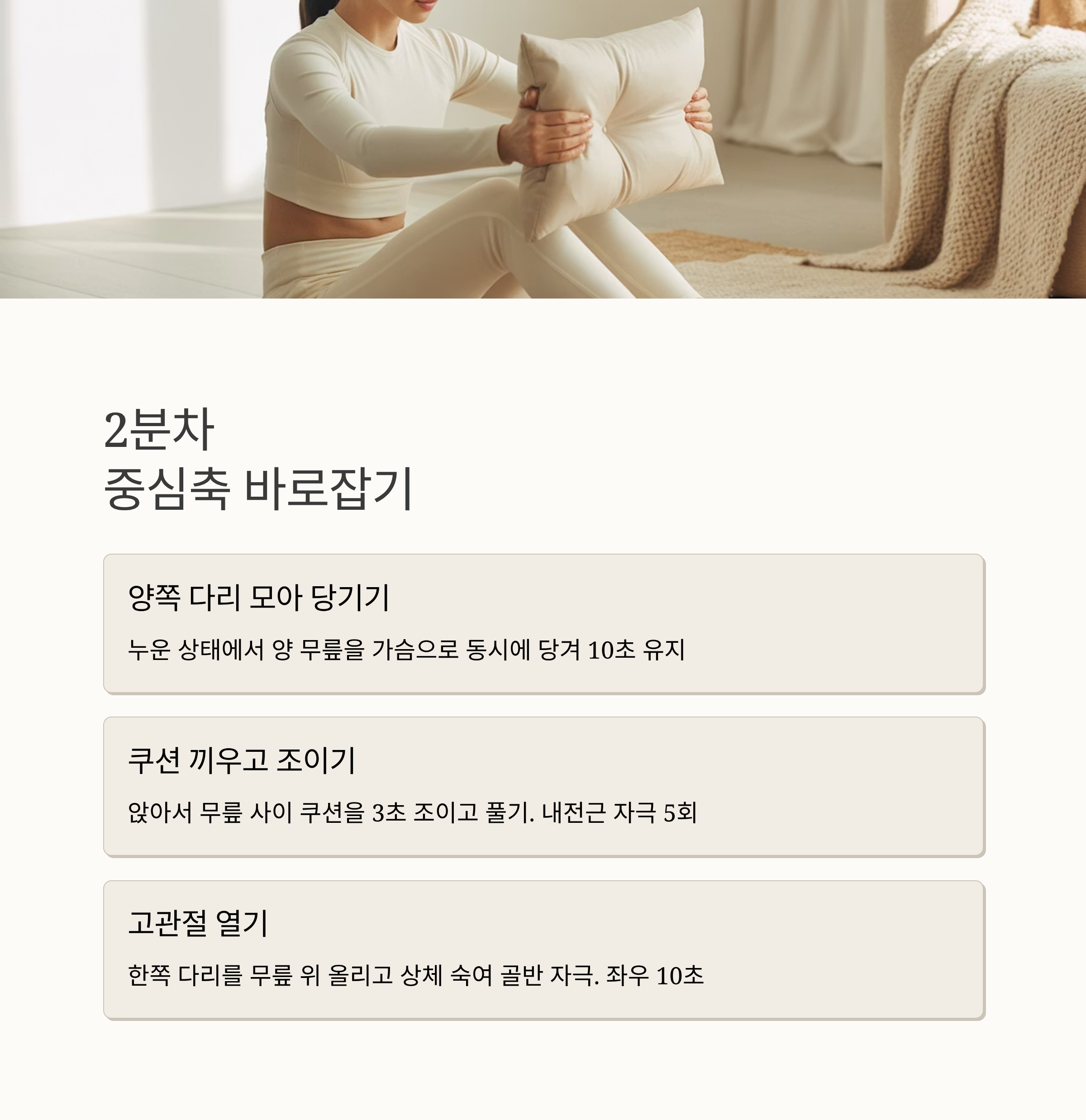 2. 무릎 사이에 쿠션 끼우고 조이기