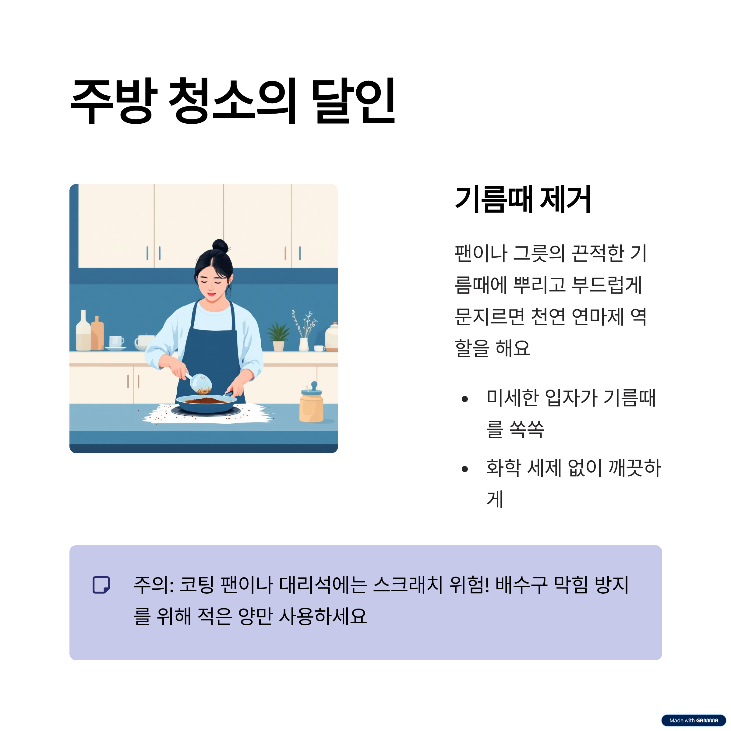 단, 코팅 팬이나 대리석에는 스크래치 위험이 있으니 사용을 피하고, 배수구 막힘 방지를 위해 많은 양을 흘려보내지 않도록 주의하세요.