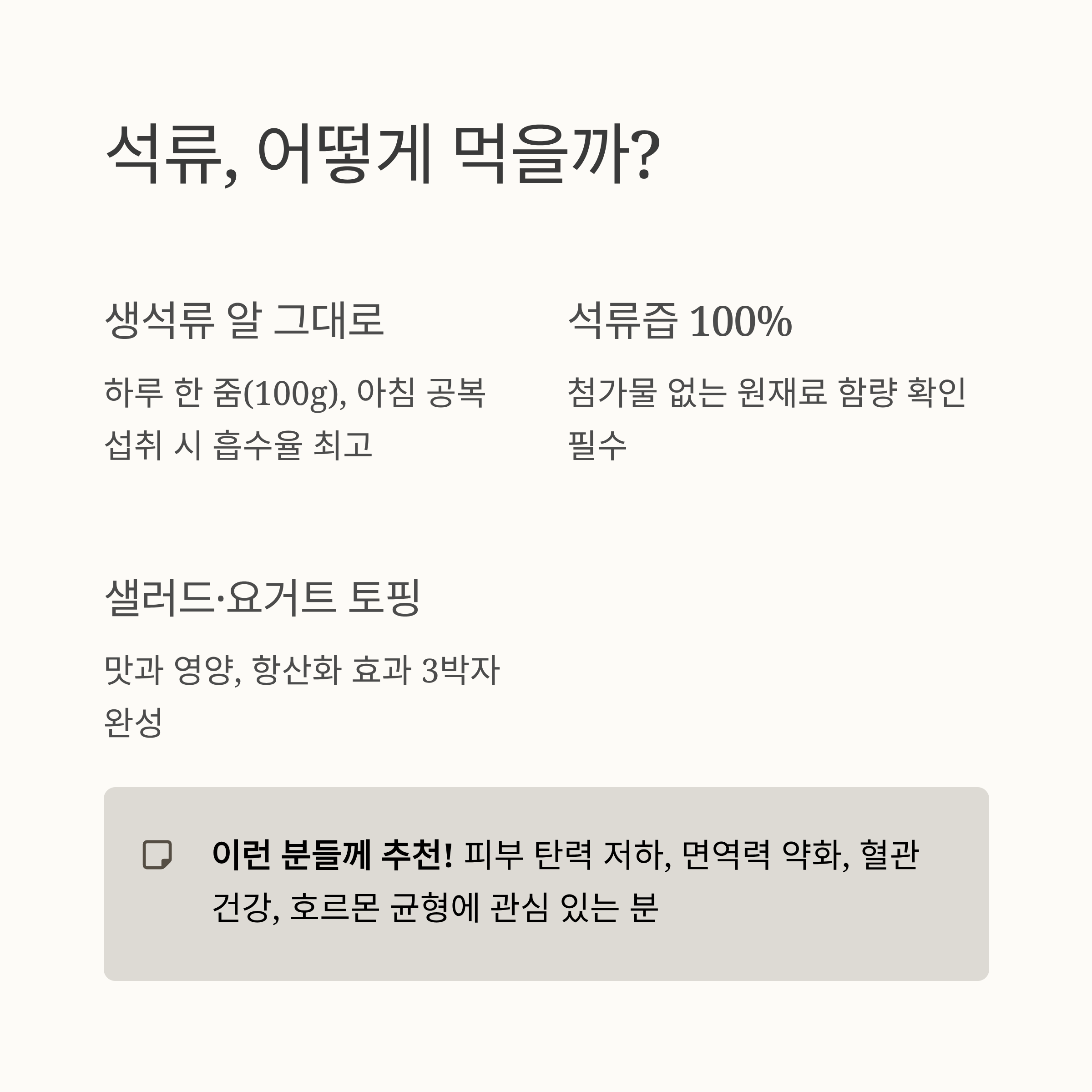 석류는 면역력과 항산화, 세포 건강까지 전반적으로 강화해주는 과일이라 볼 수 있어요.