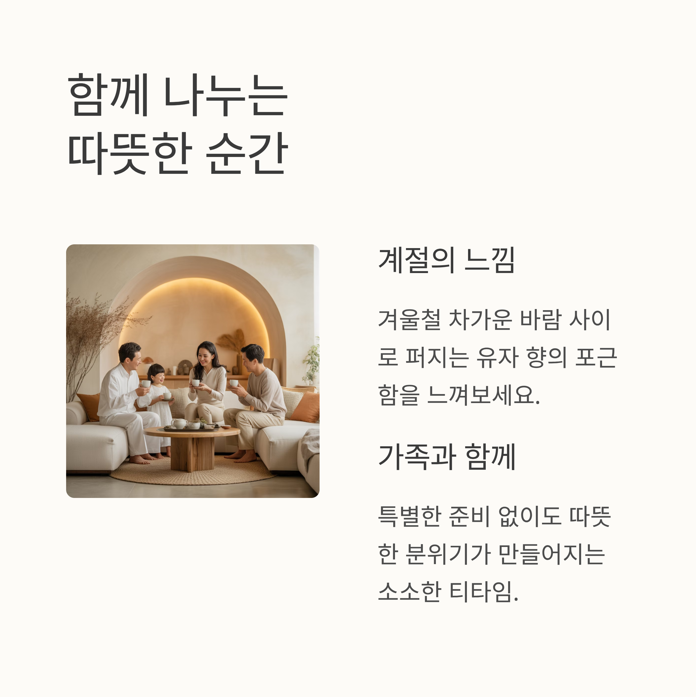 집에서 가족과 함께 유자차를 마시면 소소한 대화를 나누기에도 참 좋아요. 특별한 준비 없이도 따뜻한 분위기가 만들어지니 자연스럽게 시간이 느리게 흐르는 것 같아요.