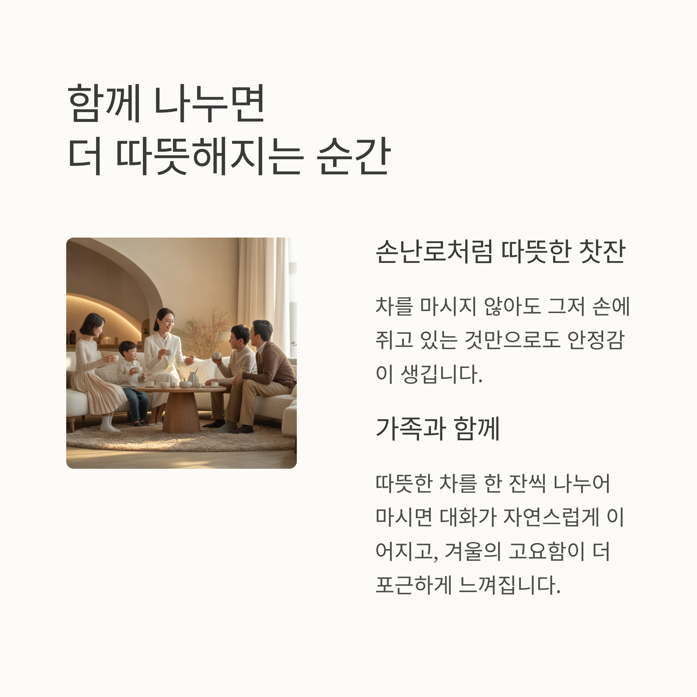 집 안에서 따뜻한 차를 한 잔씩 나누어 마시면 대화가 자연스럽게 이어지고, 겨울의 고요함이 더 포근하게 느껴집니다. 별다른 계획 없이도 그 순간 자체가 겨울의 작은 행복이 돼요.